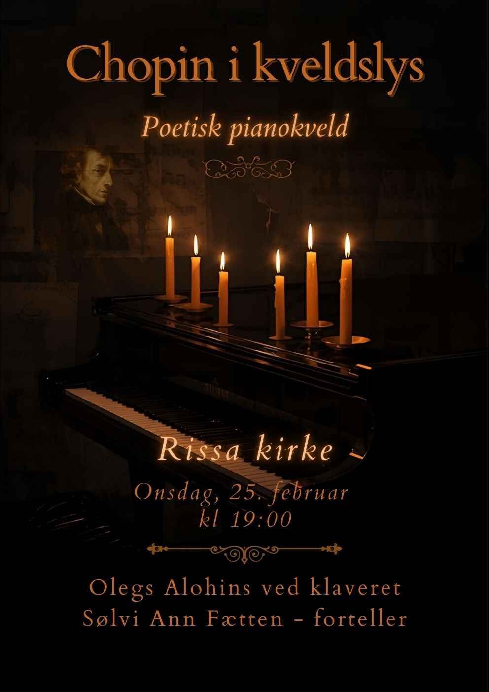 Kantor Olegs Alohins spiller mazurkaer, valser og noen av Chopins mest kjente nocturner, mens Sølvi Ann Fætten deler små fortellinger og refleksjoner mellom stykkene.